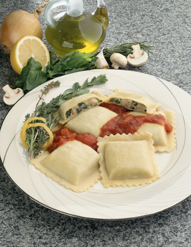 servire i ravioli in un piatto da portata caldo, cosparsi di